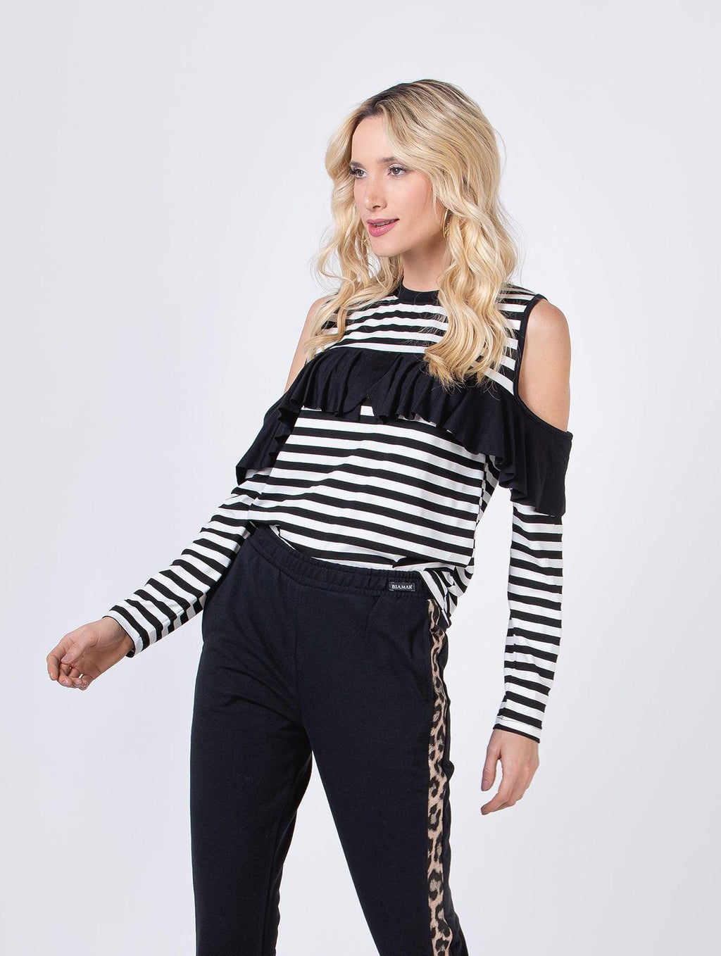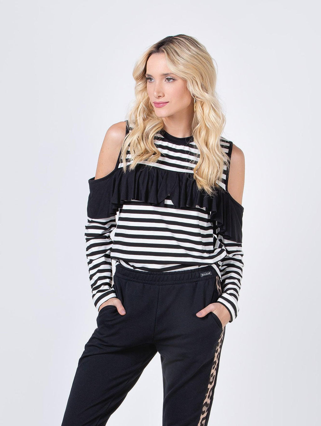 Para destacar os seus looks da temporada, invista na blusa com padronagem em listras, gola redonda, babados e abertura lateral nas mangas Urbanity 008512. O modelo possui design moderno e despojado, perfeito para composições casuais. Além disso, o detalhe em babados agrega um efeito charmoso e delicado. Descubra o conforto e a elegância da Biamar em cada detalhe desta peça incrível. Não perca a oportunidade de ter uma peça-chave no seu armário.